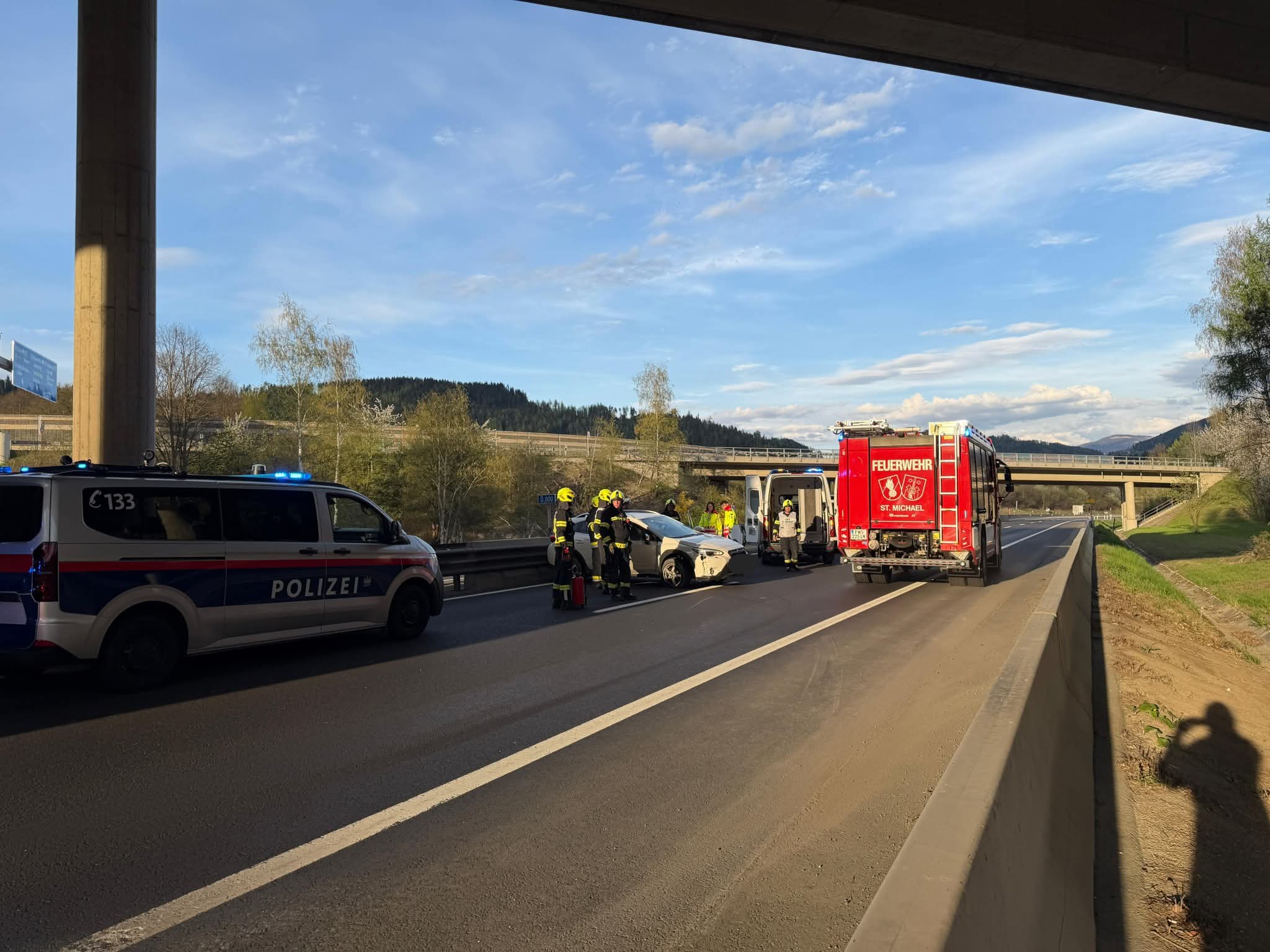 Ein PKW touchierte die Betonleitwand und kam auf der Überholspur zu stillstand. Die zwei verletzten Personen wurden bis zu eintreffen des Roten Kreuz von einem vorbeikommenden Arzt und zwei Feuerwehrsanitäter Erstversorgt.