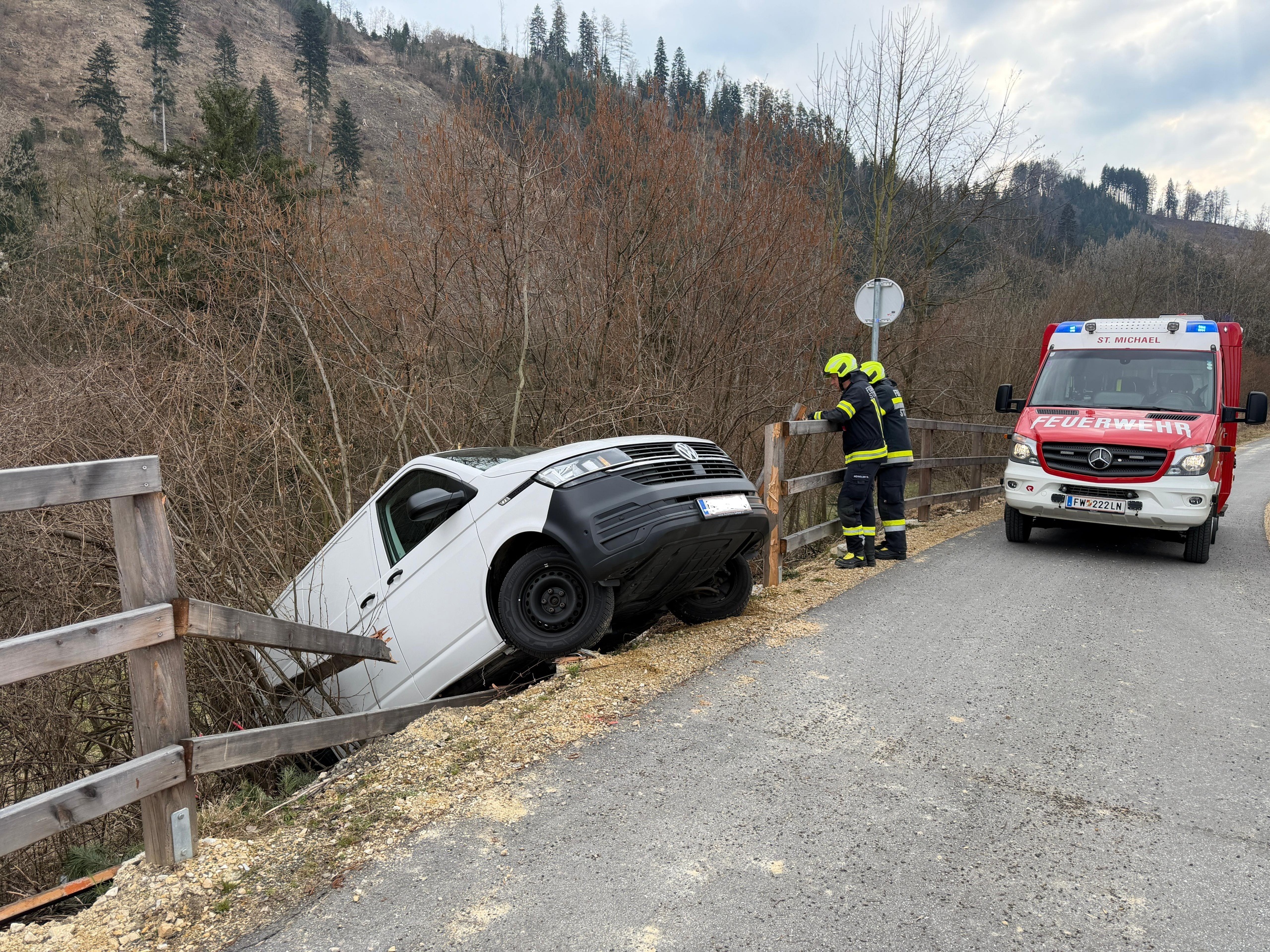 Am Einsatzort angekommen stellte sich heraus, dass ein Transporter rückwärts über den Radweg in Auwald durch einen Holzzaun über eine Böschung gestürzt war.