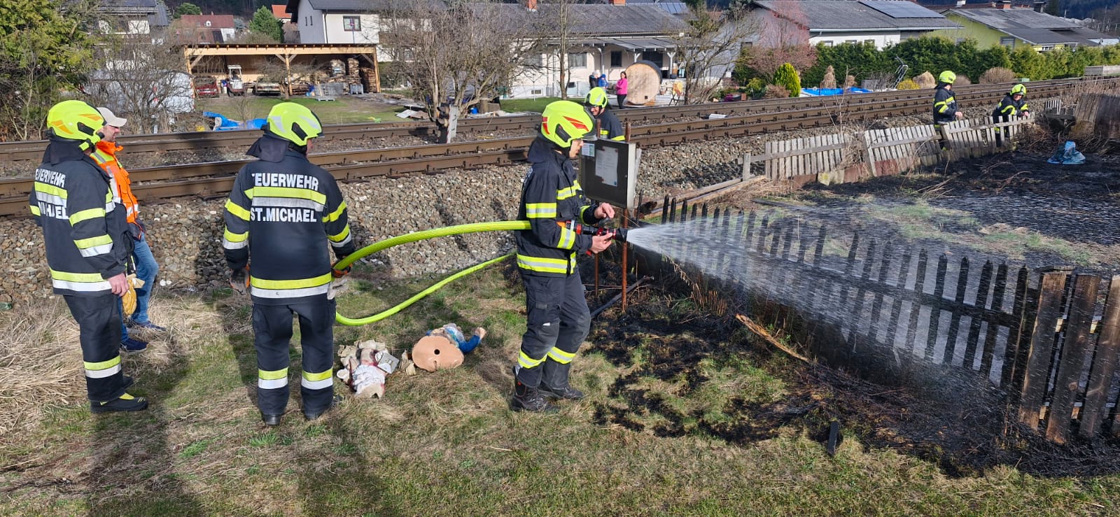 Gestern am späten Nachmittag wurden wir zu einem Kleinbrand im Bereich des Gleisdreiecks alarmiert. Beim Eintreffen stand ein Zaun sowie die, im eingezäunten Bereich liegende Wiese in Brand.